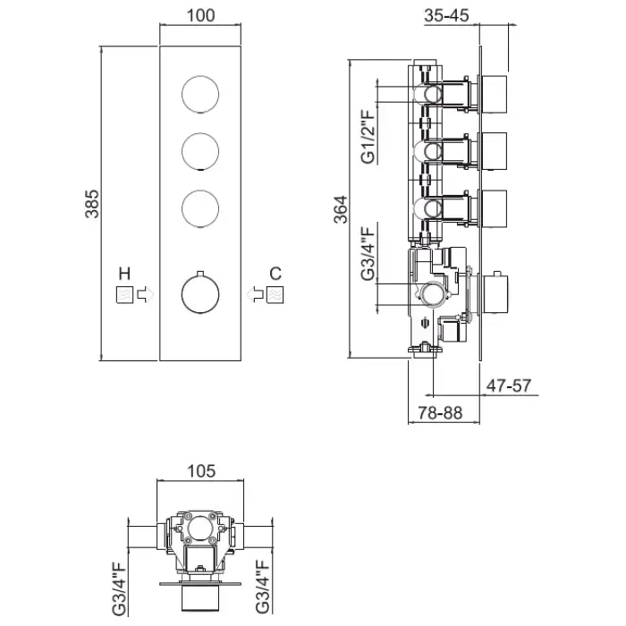 QuadroDesign Универсальная IN050 Встраиваемая часть смесителя термостатического из стены с 3-мя запорными вентилями