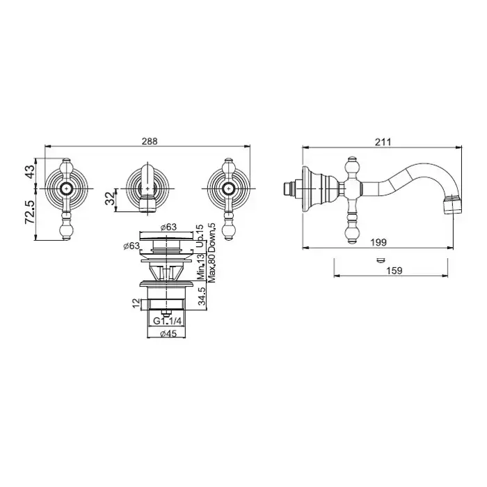 FIMA|Carlo Frattini Epoque Смеситель для раковины настенный, на 3 отверстия, излив 200 мм., внешняя часть, донный клапан click-clack, цвет хром