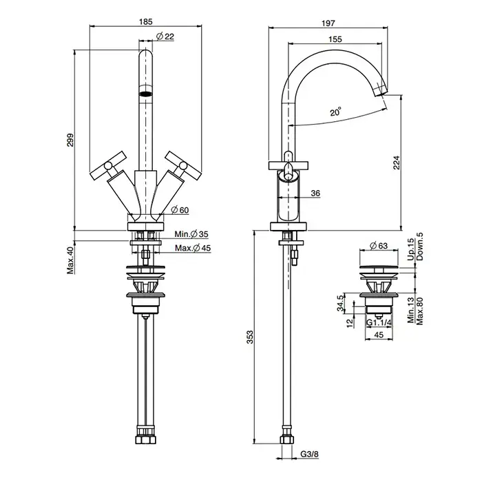 Fima Carlo Frattini, Bathroom Maxima, Смеситель для раковины, вентильный, на 1 отв., высота, мм-299, излив поворотный 155мм, донный клапан, цвет-хром