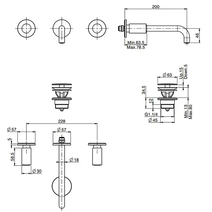 FIMA|Carlo Frattini So Смеситель для раковины, настенный монтаж, на 3 отв, без ручек, излив 200 мм., внешн часть, донный клапан click-clack, цвет хром