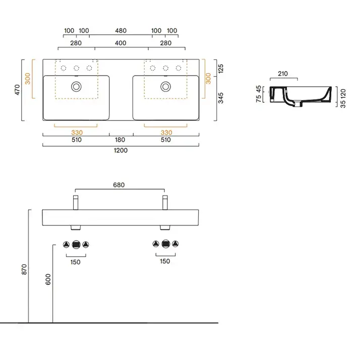Catalano PREMIUM Раковина 120x47 двойная, с 2 отв. под смеситель, покрытие Cataglaze+, цвет белый глянцевый