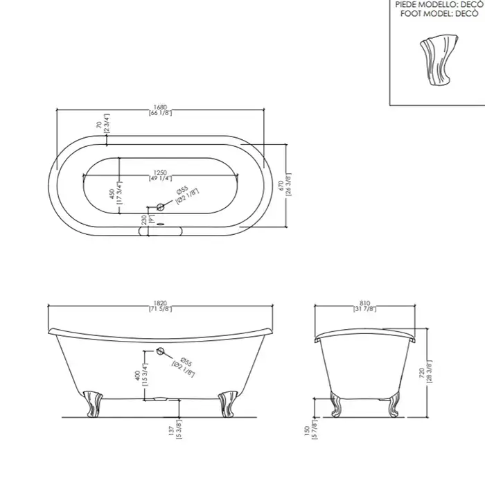 Devon Admiral Ванна чугунная (без отв-й для смес),182х81хh72см, цвет: белый, снаружи под окраску, ножки Deco, алюминий полированный (без слива-перел)