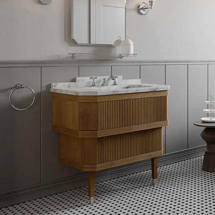 Devon Metropolitan Essenc Тумба под раковину из дуба 88.5х95 см, стол. BIANCO CARRARA, рак. SWINDON на 3 отв белая , ножки хром,цвет мебели ROVERE