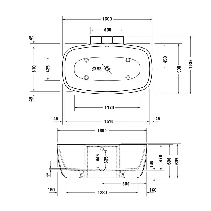 Duravit Aurena Ванна пристенная 1600 x 1035 мм, из материала DuroCast Plus, в коплекте сливной гарнитур, ,Цвет: Белый матовый