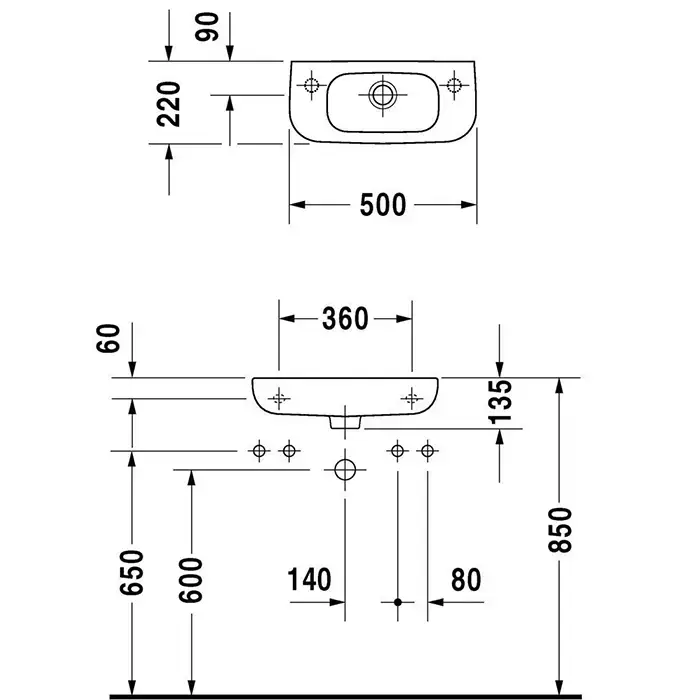 Duravit D-Code Раковина для рук с перел., с 1 отв. под смес. справа, 500x220мм, Цвет: Белый