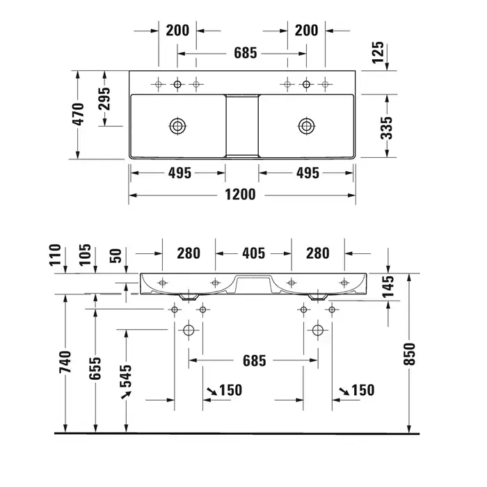 Duravit DuraSquare Раковина подвесная двойная без перелива, выпуск с керам покрытием, 2 отм. отв под смес, 120х47см, цвет белый