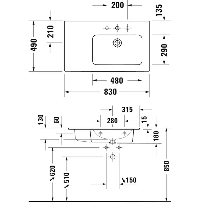 Duravit ME by Starck Раковина подвесная с переливом, с полкой слева, 1 отв под смес, 83х49см, цвет: белый
