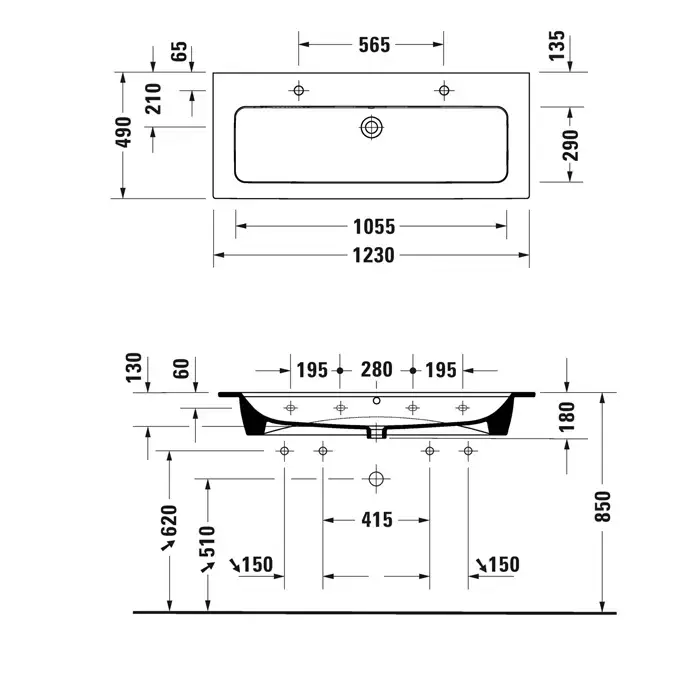 Duravit ME by Starck Раковина для мебели 1230х490 мм, с переливом, с площадкой, с 2 отв. под смеситель, Цвет белый