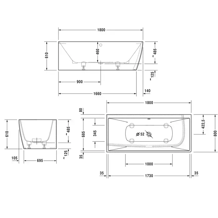 Duravit Vitrium Ванна встраиваемая 180x80см, Sx, с ножками, с2 наклонами для спины, прямоугольная, цвет: белый