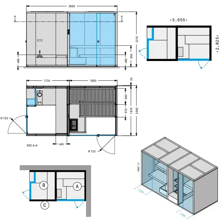 Effegibi BodyLove SH 365x202xh220 см, размещ. в угол D.X., сауна-термообр.дерево, хаммам гл-ое стекло, наруж. стены термообр. древесина гл-ая