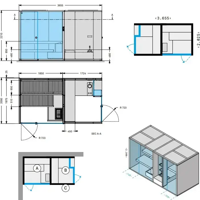 Effegibi BodyLove SH 365x202xh220 см, размещение в угол S.X., отделка сауны хемлок, хаммам трубчатое стекло (Flutes), наружные стены гладкий хемлок