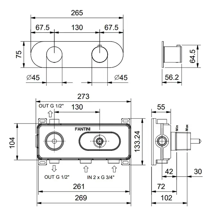 Fantini AF/21 Встраиваемый смеситель для душа на 2 потока, цвет: Matt Gun Metal PVD