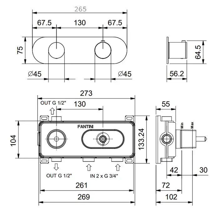 FANTINI AA/27 Смеситель настенный встраиваемый, термостатический, с переключателем на 2 положения, внешняя часть, отделка Matt Gun Metal PVD