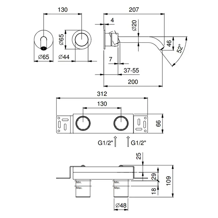 Fantini AA/27 Смеситель для раковины, встраиваемый, излив: 20.7см., внешняя часть, цвет: матовая натуральная сталь