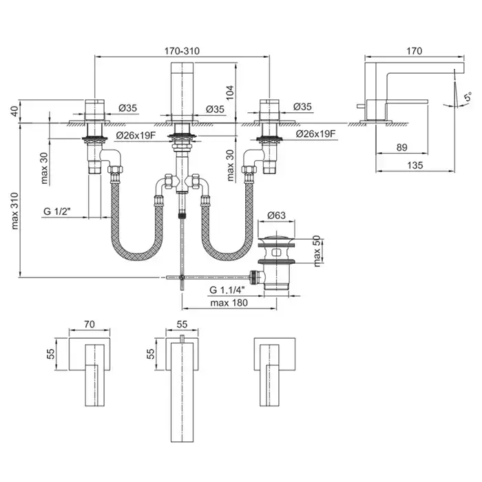 Fantini AR/38 Смеситель для раковины, 3 отв., с донным клапаном, излив 135мм, цвет: хром
