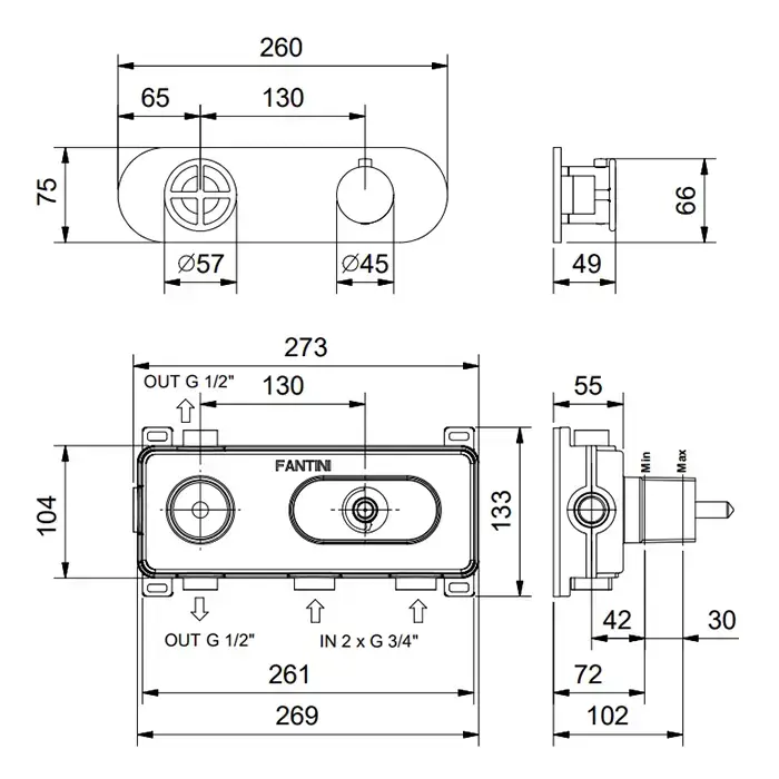 Fantini Fontane Bianche Смеситель настенный встраиваемый, термостатический, с переключателем на 2 положения, цвет Matt Gun Metal PVD