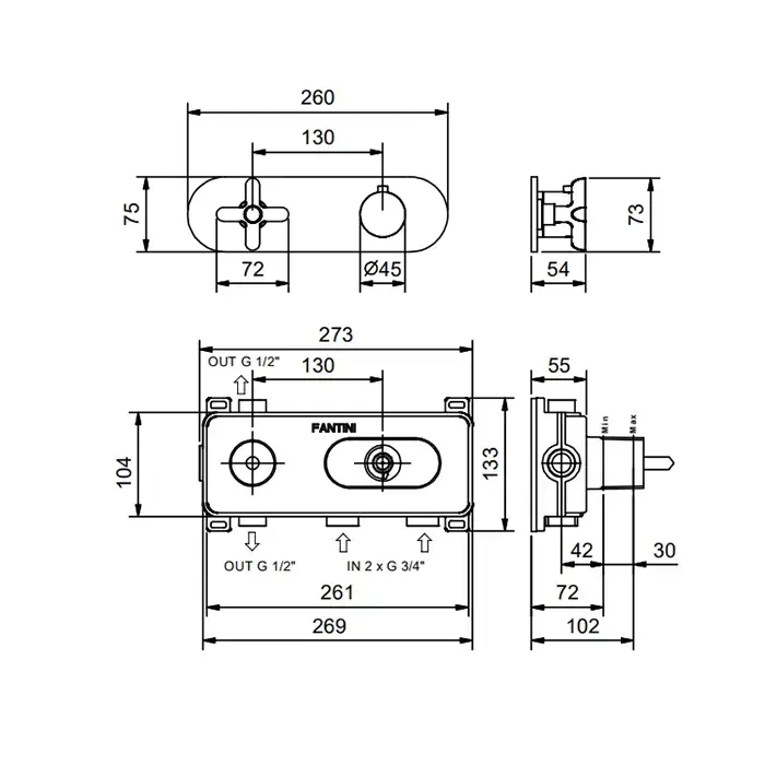 Fantini Icona Classic Смеситель для душа, термостатический, на 2 источника, 3/4", (наружняя часть), цвет: черный матовый