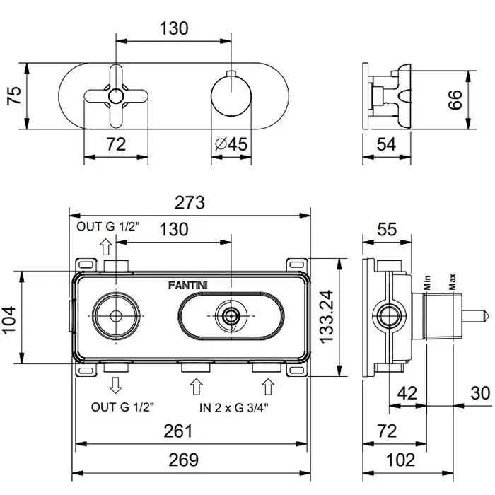 Fantini Icona Classic Смеситель для душа, встраиваемый, термостатический, на 2 источника, 3/4", (наружняя часть), цвет: Matt Copper PVD