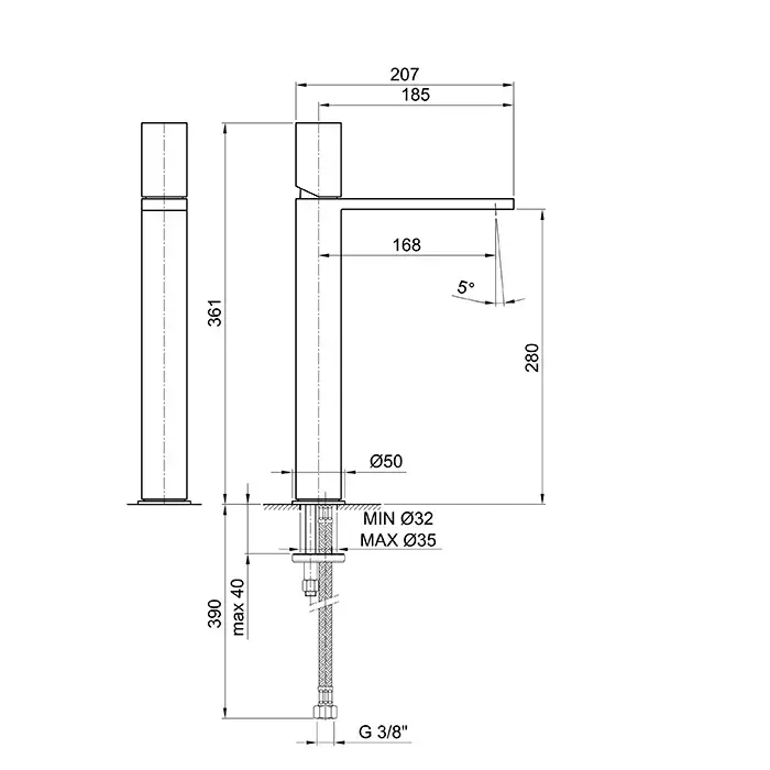 Fantini Milano Смеситель для раковины, 1 отв., без донного клапана, излив 170мм, h=280мм, цвет: матовая натуральная сталь