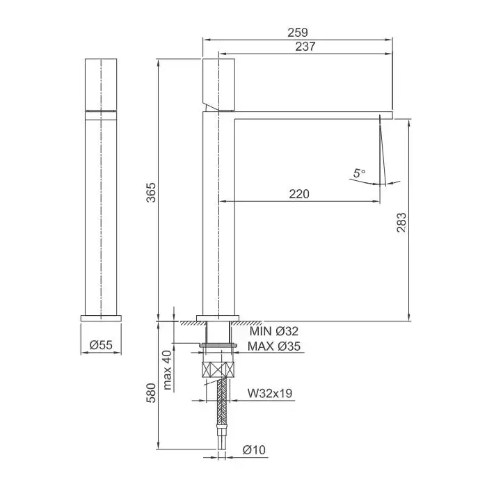 Fantini Milano Смеситель для раковины, 1 отв., без донного клапана, излив 220мм, цвет: матовая натуральная сталь
