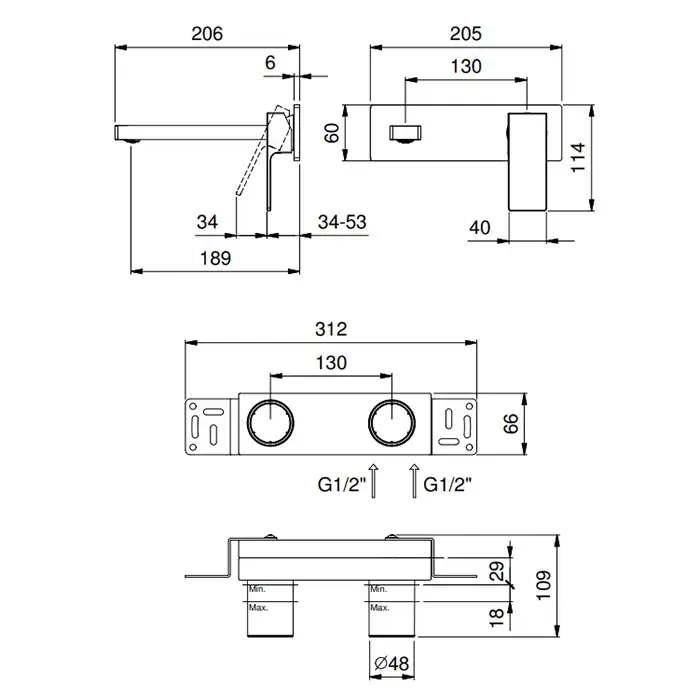 FANTINI MINT Смеситель для раковины, встраиваемый, на 2 отв, без донного клапана, излив 190мм (наружняя часть), цвет: черный матовый