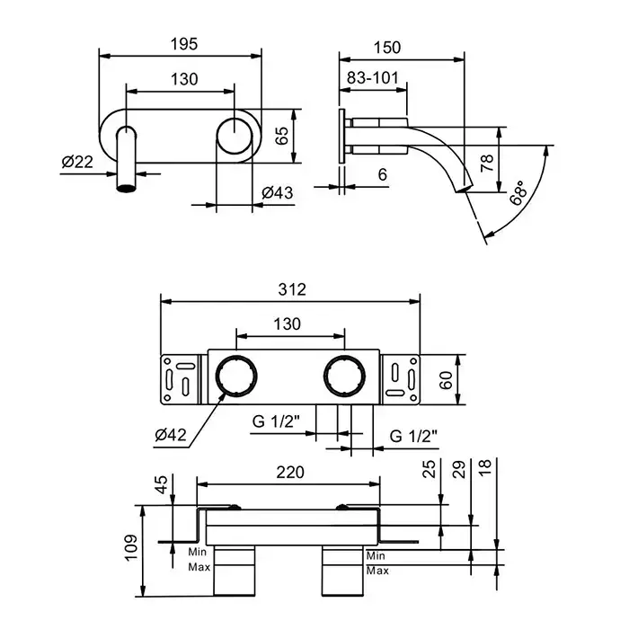 Fantini Nice Смеситель для раковины, встраиваемый, на 2 отв, без донного клапана, излив 150мм (наружняя часть), цвет: хром