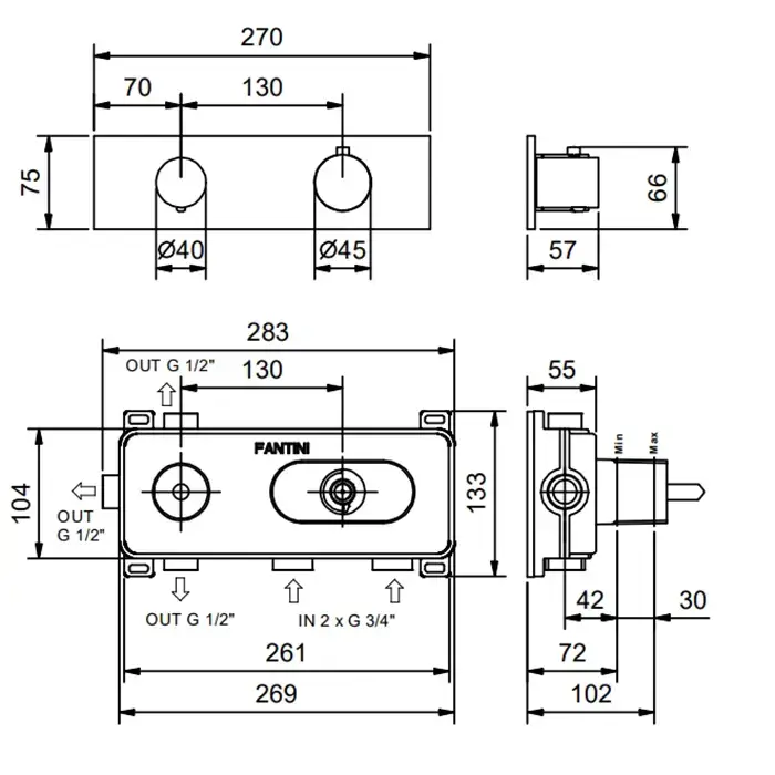 Fantini NOSTROMO Термостат. встраив. смес-ль для душа, 3/4'' наружная часть, 3 потока, цвет: хром