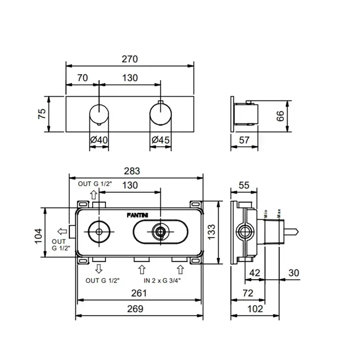 Fantini NOSTROMO Термостат. встраив. смес-ль для душа, 3/4'' наружная часть, 3 потока, (наружная часть) цвет: Matt British Gold PVD