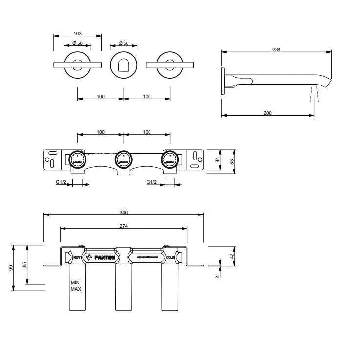 Fantini Sailing Смеситель для раковины, настенный, цвет: Matt Gun Metal PVD