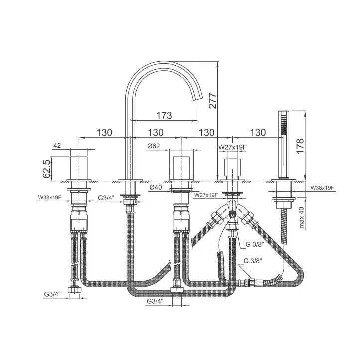 Fantini Venezia Смеситель для ванны, набортный, 5 отв., излив: 175 мм, цвет: Nickel PVD