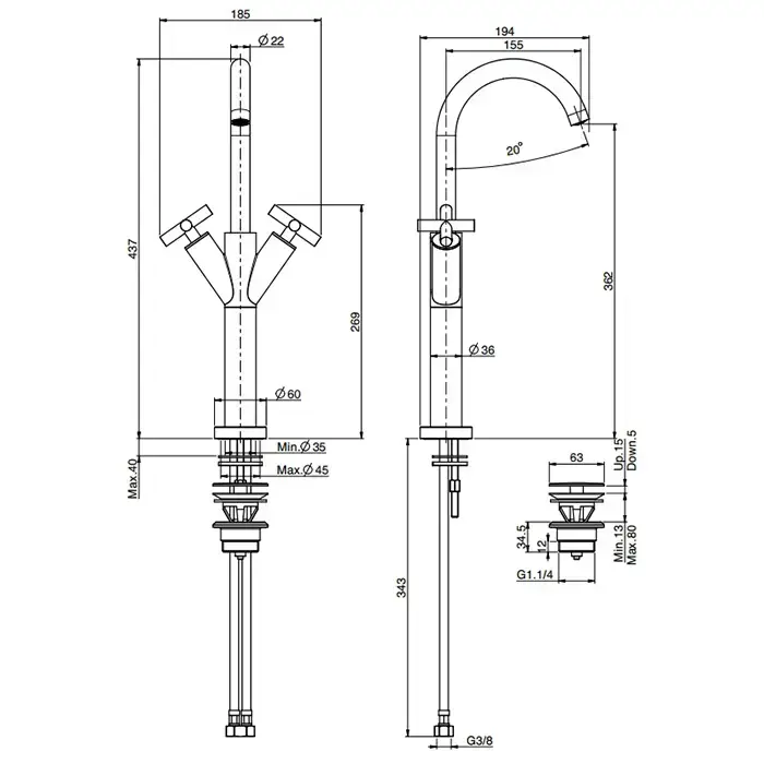 Carlo Frattini Maxima Смеситель для раковины, встраиваемый, на 3 отв., излив 20см., внешняя часть, с донным клапаном, цвет: хром