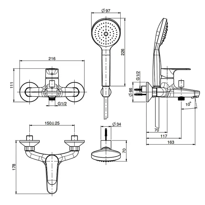 Fima Carlo Frattini Serie 22 Смеситель для ванны, настенный, с ручным душем, цвет: чёрный матовый