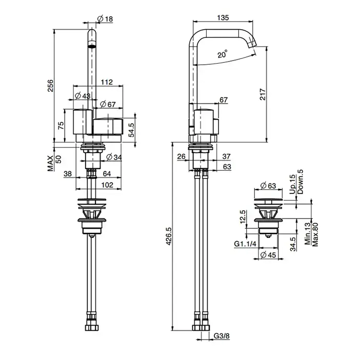 Carlo Frattini So Смеситель для раковины, высота 329мм, на 3 отверстия, вращающийся излив Ø 18мм, донный клапан click-clack, цвет: хром
