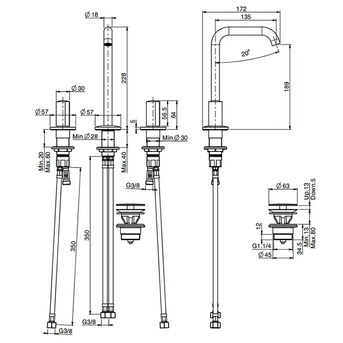 Carlo Frattini So Смеситель для раковины, высота 329мм, на 3 отверстия, вращающийся излив Ø 18мм, донный клапан click-clack, цвет: хром