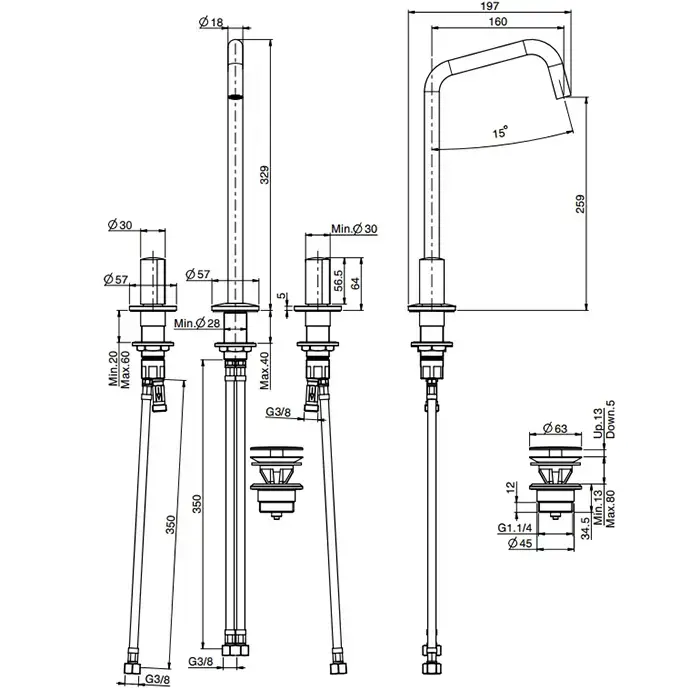 Carlo Frattini So Смеситель для раковины, высота 329мм, на 3 отверстия, вращающийся излив Ø 18мм, донный клапан click-clack, цвет: хром