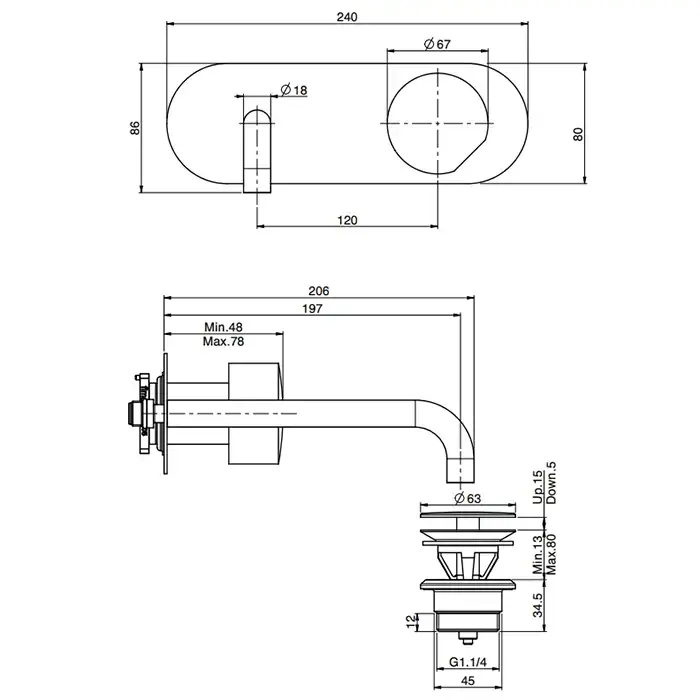 Fima Carlo Frattini So F3191/5CR Смеситель для раковины настенный, на 3 отв, излив 150 мм., донный клапан click-clack, цвет: хром