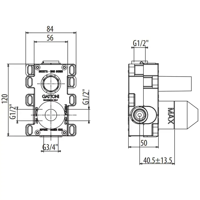 Gattoni GBOX Универсальная монтажная коробка под встраиваемый смеситель для душа с 2-мя выходами, входы 1/2", цвет хром (Снято с пр-ва)