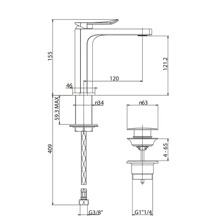 Gattoni Soffio Смеситель для раковины на 1 отверстие, однорычажный, высота 121,2 мм., с донным клапаном clic-clac, цвет: Brushed nickel