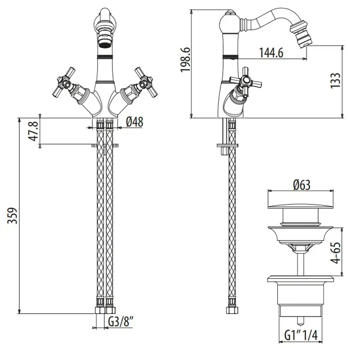 GATTONI TRD Смеситель для биде на 1 отверстие, ручки Paris, высота излива 133 мм., с донным клапаном, цвет хром