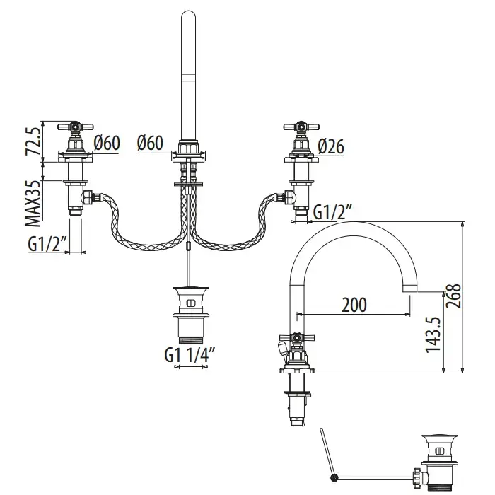 Gattoni TRD Смеситель для раковины, 3 отв., ручки Paris, цвет: хром