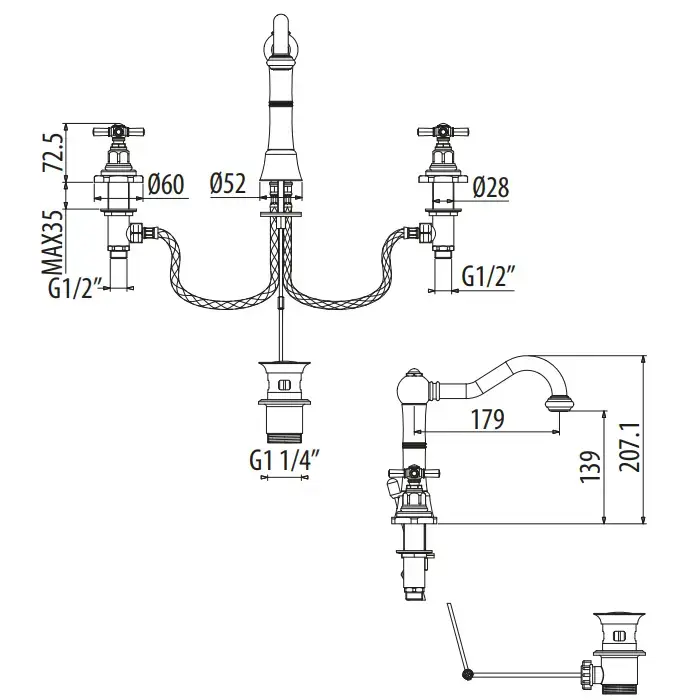 GATTONI TRD Смеситель для раковины на 3 отверстия, ручки Paris, высота излива 139 мм., с донным клапаном, цвет золото 24 К