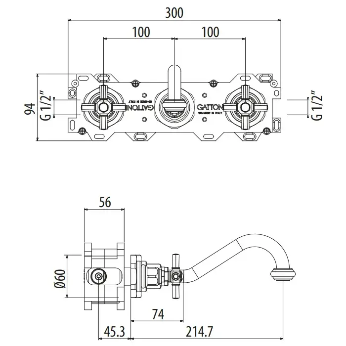 GATTONI TRD Смеситель для раковины на 3 отверстия, настенный монтаж, ручки Paris, излив 214,7 мм., в комплекте со скрытой частью Gbox SC076, цвет хром