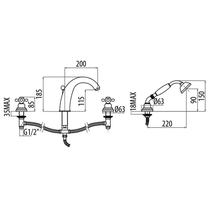 Gattoni Vivaldi Смеситель для ванны набортный на 4 отверстия с ручной лейкой, цвет хром (Снято с пр-ва)