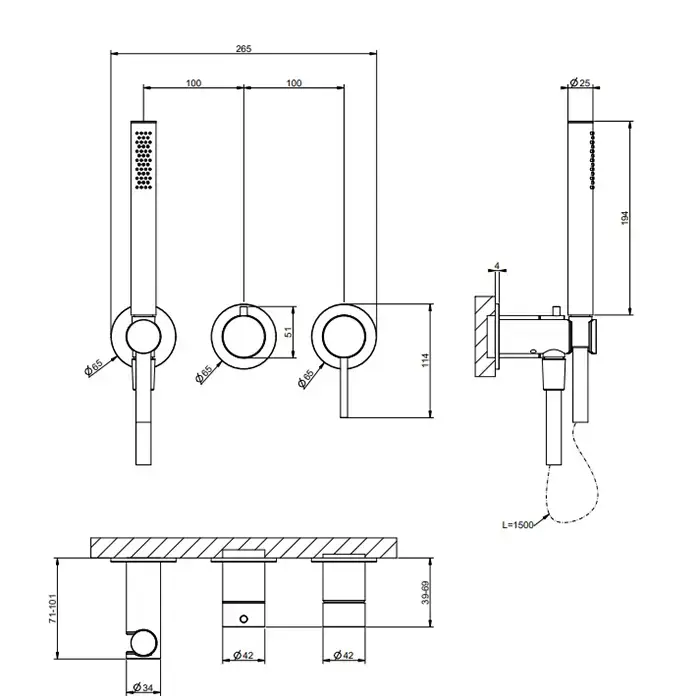 GESSI 316 Смеситель встраиваемый, однорычажный, с переключателем на 2 полож, держ с подв воды, ручн душ и шланг 1500 мм, цвет Black Metal Brushed PVD