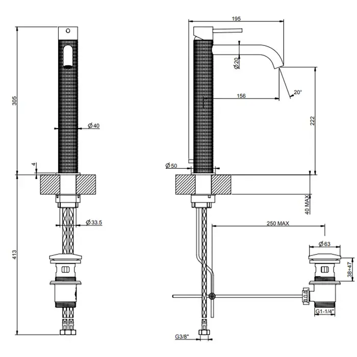 GESSI 316 Смеситель для раковины на 1 отверстие, высокий h=305мм, с донным клапаном, излив 156мм, цвет: brushed black metal pvd