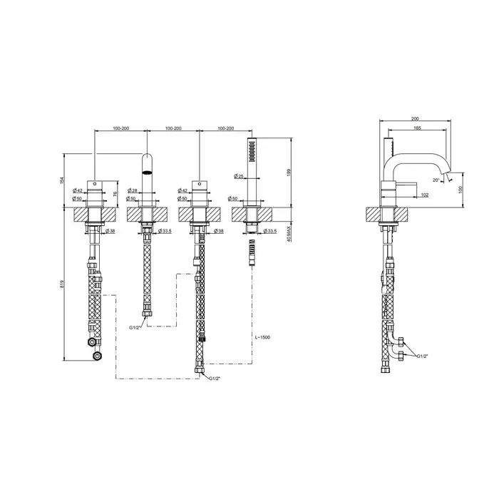 GESSI 316 Смеситель на борт ванны на 4 отв. с изливом и ручным душем, Black XL