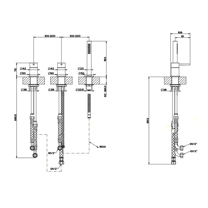 Gessi Bath316 Смеситель для ванны на 3 отверстия, убирающаяся душевая лейка. цвет: шлифованная сталь