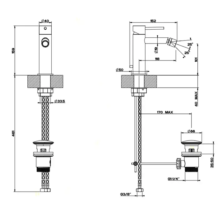 GESSI 316 Смеситель для биде на 1 отверстие с донным клапаном, излив 118мм, цвет: steel brushed