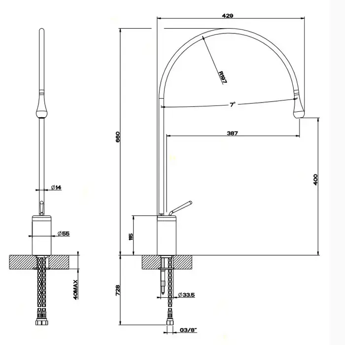 Gessi Goccia Смеситель для раковины на 1 отверстие, излив 387мм R=197, цвет: хром