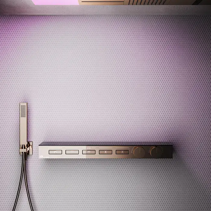 Gessi Hi-Fi Термостат для душа, с вкл. до 5 источников одновременно, с полкой из черного мат. стекла, внешняя часть, цвет: Copper PVD